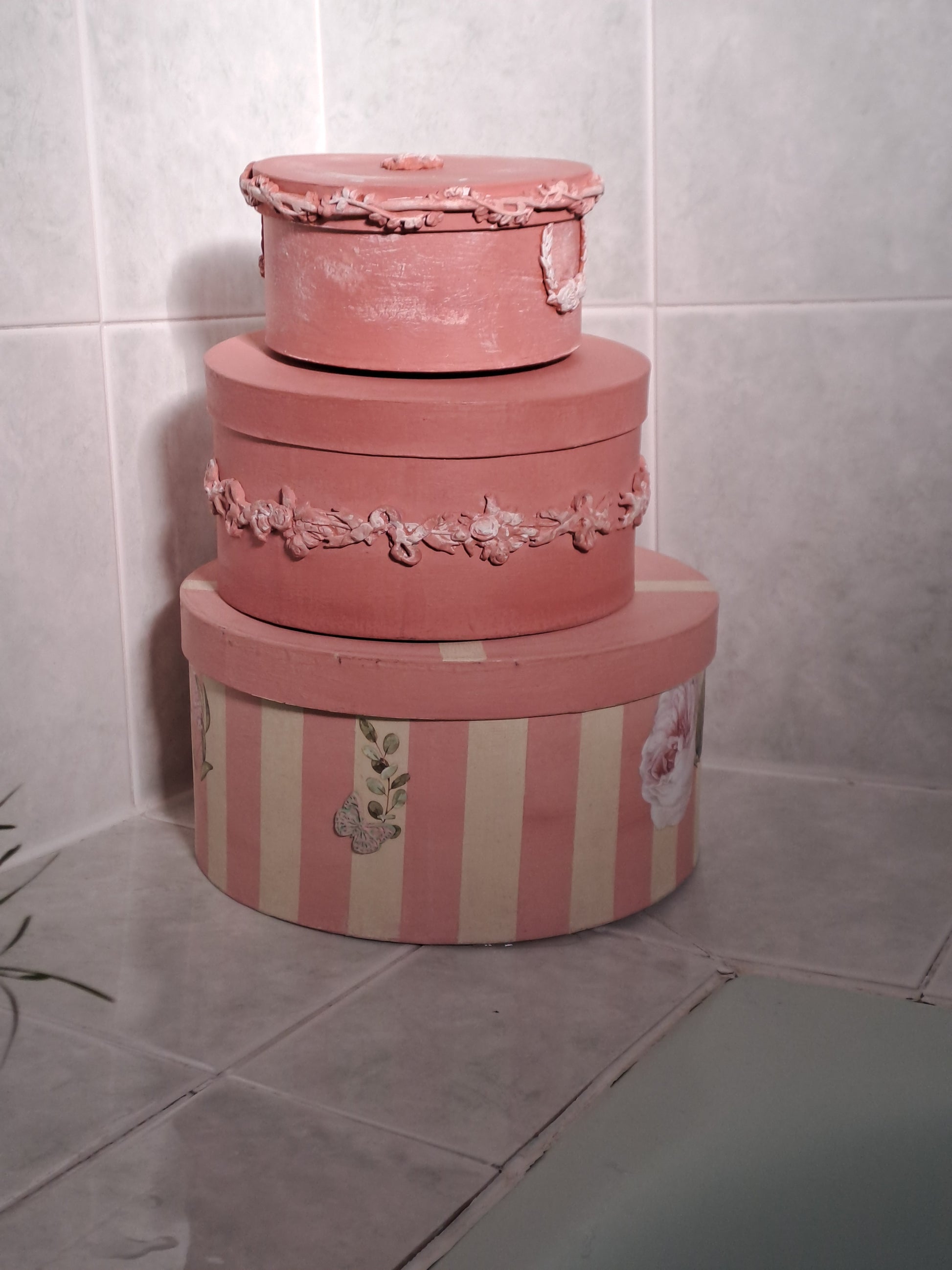 Un ensemble de trois boîtes gigognes relookées à la main dans un doux rose poudré. Moulures délicates, décors floraux et charme romantique pour une décoration raffinée et poétique. Pièces uniques réalisées artisanalement avec des peintures éco-responsables. Idéales pour offrir ou sublimer votre intérieur !