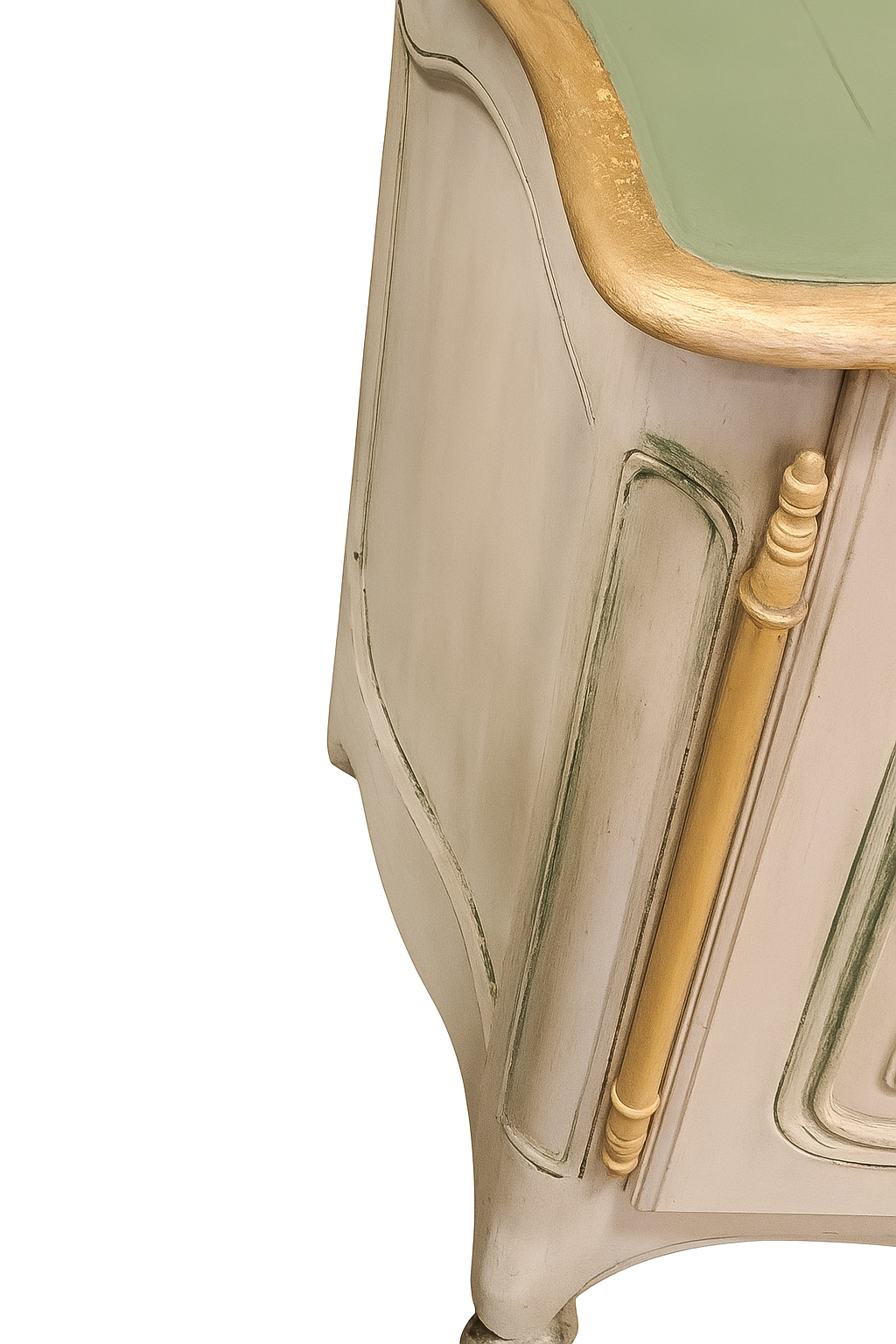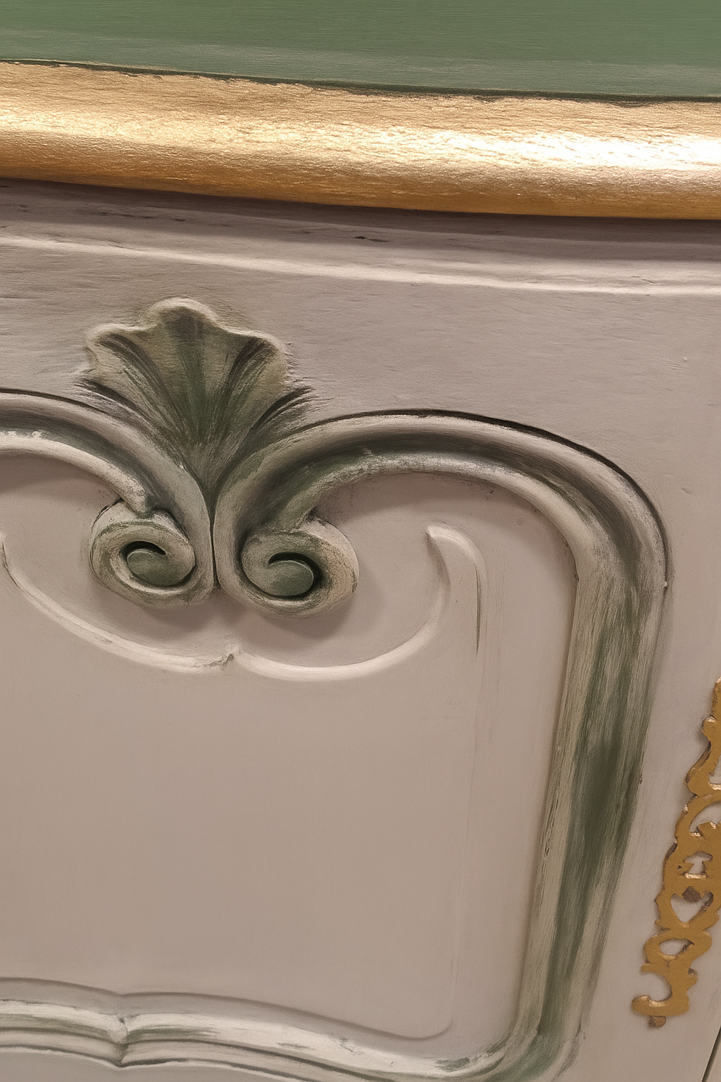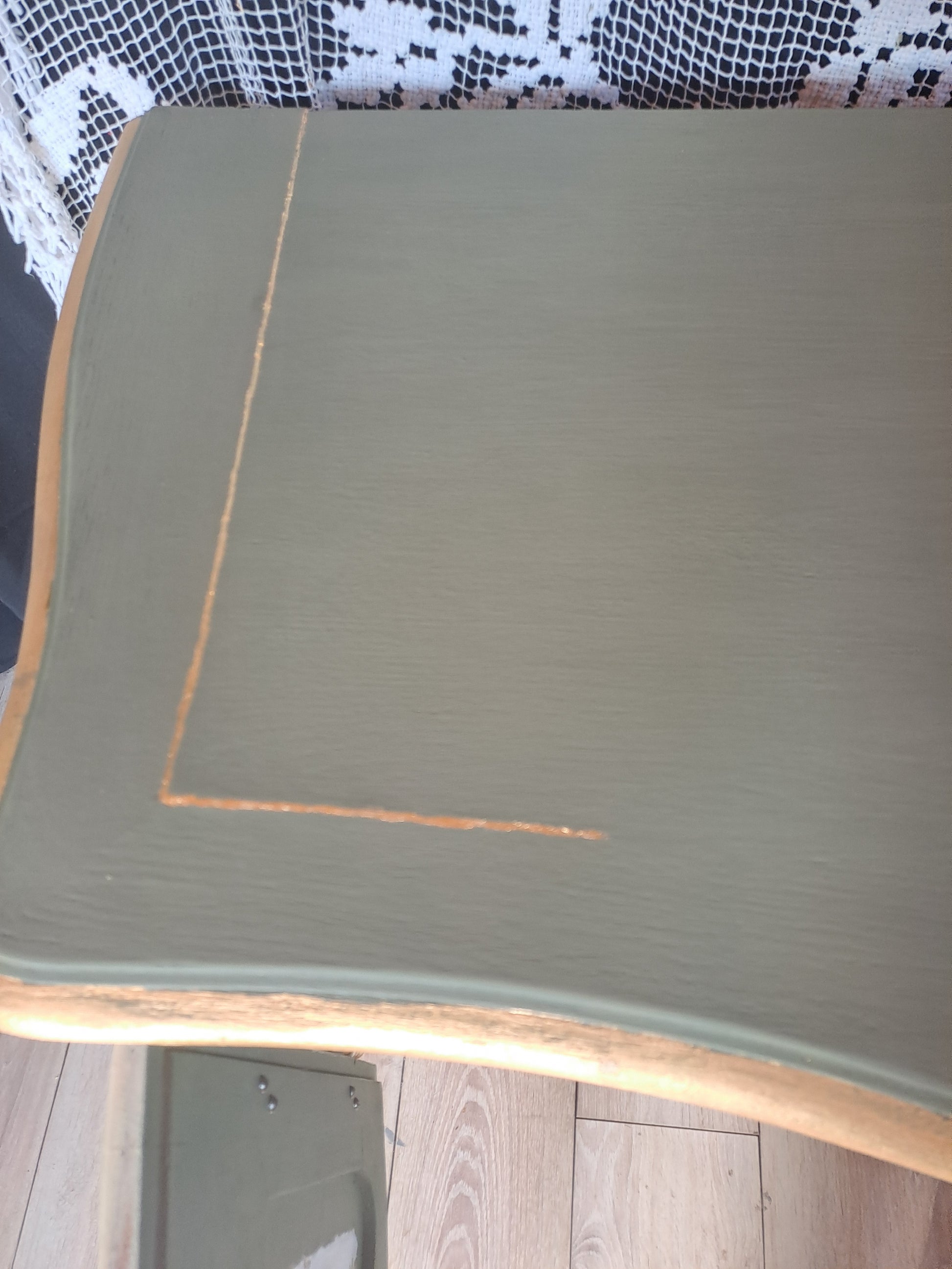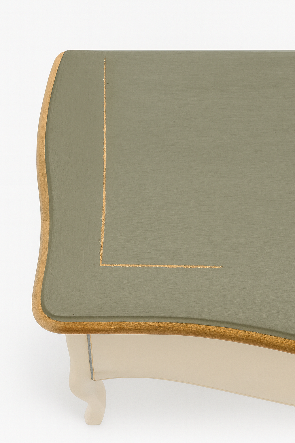 Il a été peint avec 2 couleurs juxtaposées de peinture à la craie (vert olive et blanc).