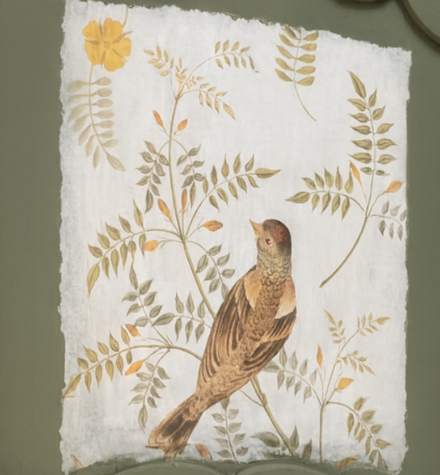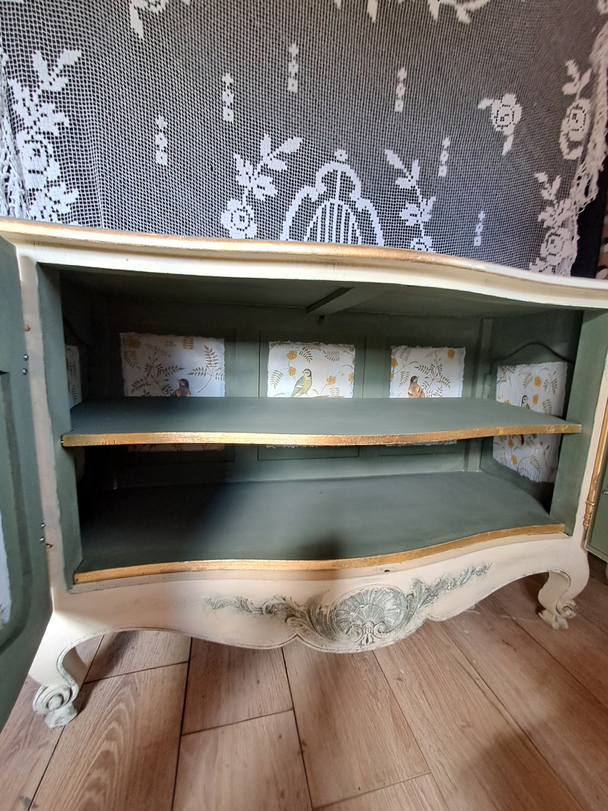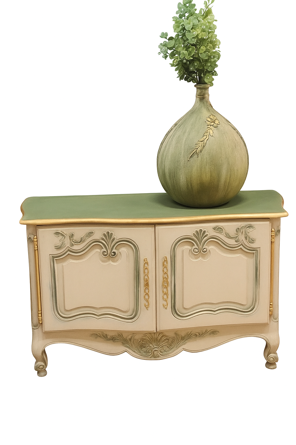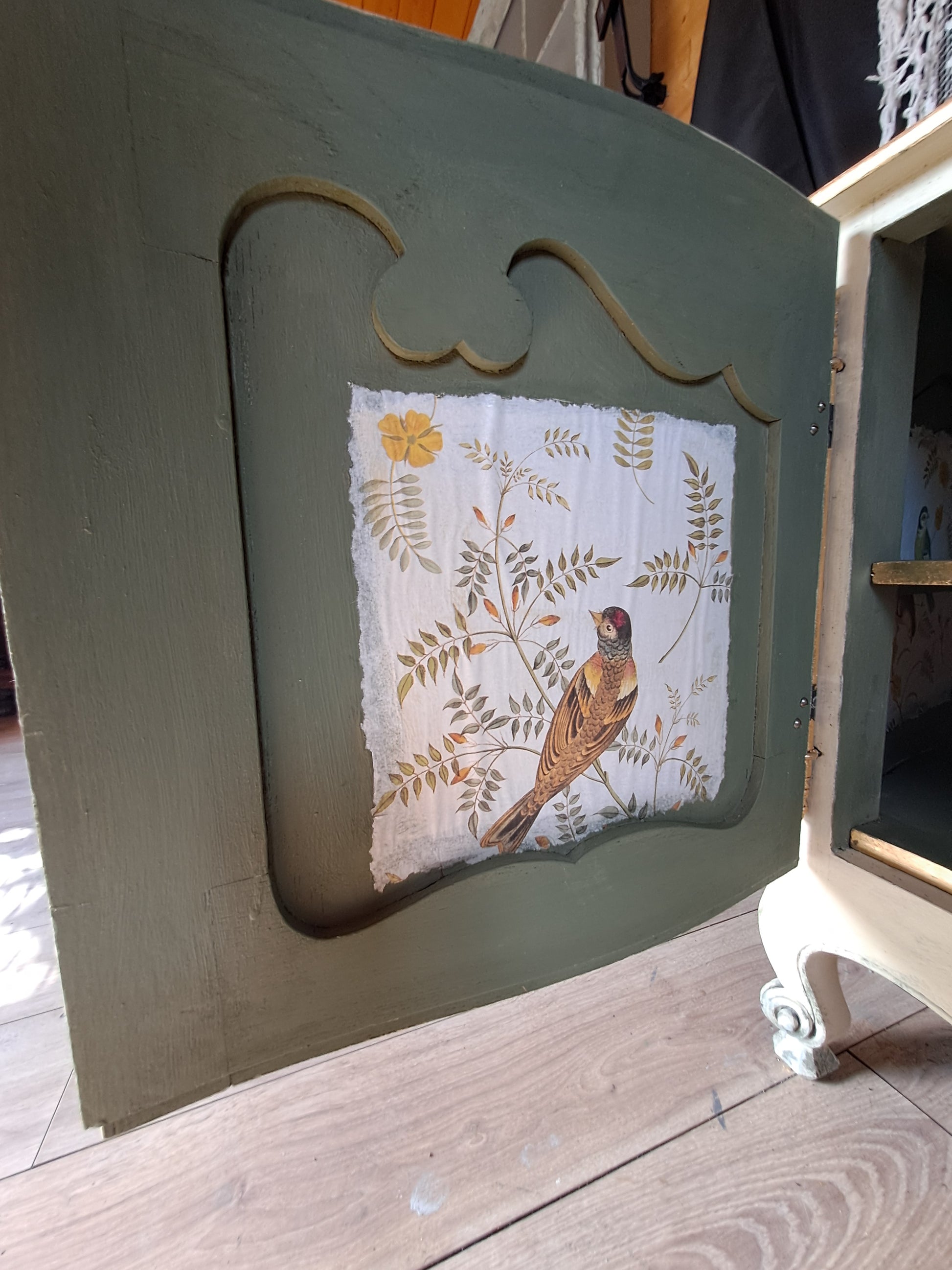 Il a été peint avec 2 couleurs juxtaposées de peinture à la craie (vert olive et blanc).
