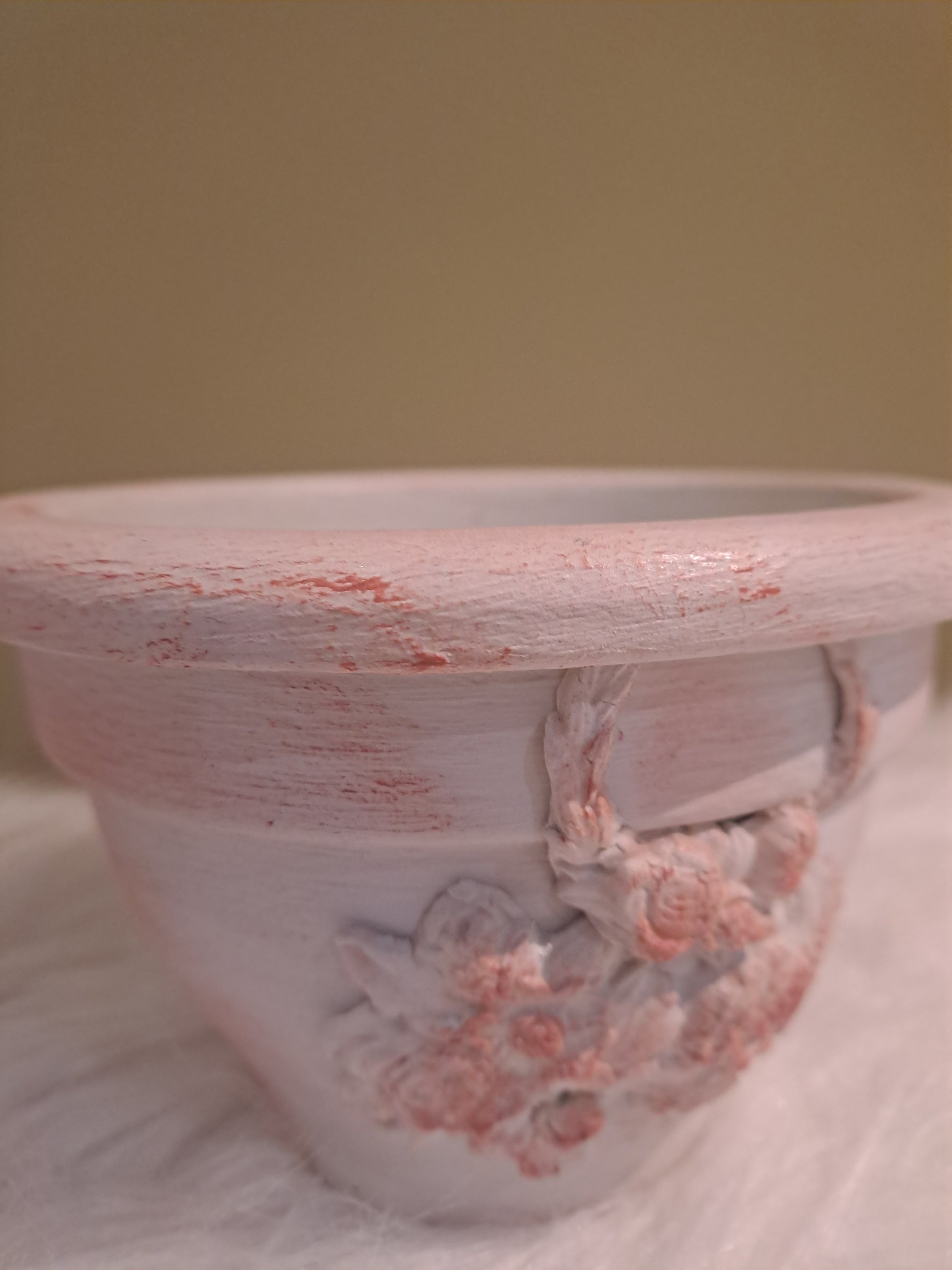 - H 15 cm Diamètre 12 cm . Matériaux : terre cuite + peinture à la craie + pâte à modeler + cire incolore