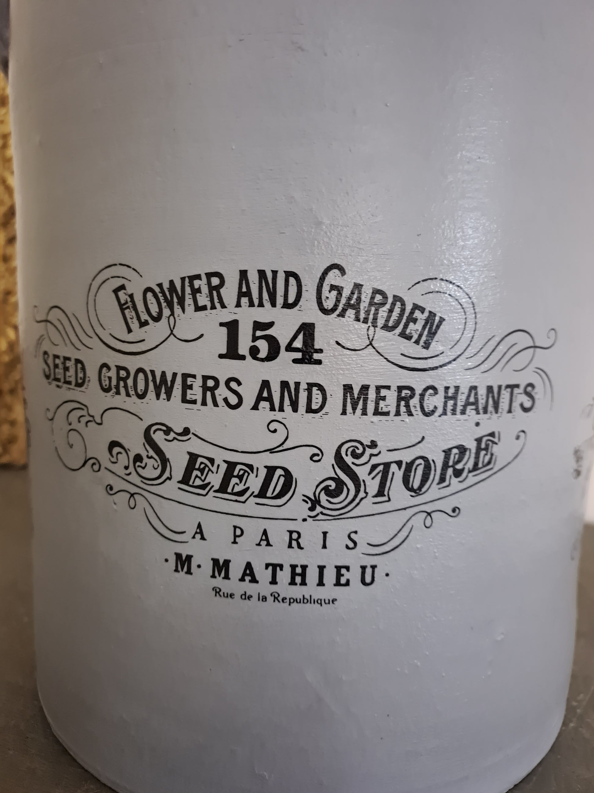 Ancien pot à salaison/graisse remis au goût du jour. Peint en gris acrylique, et orné d'images noires et reflets noirs puis vernis. 27x20x16 cm - 2h de travail
