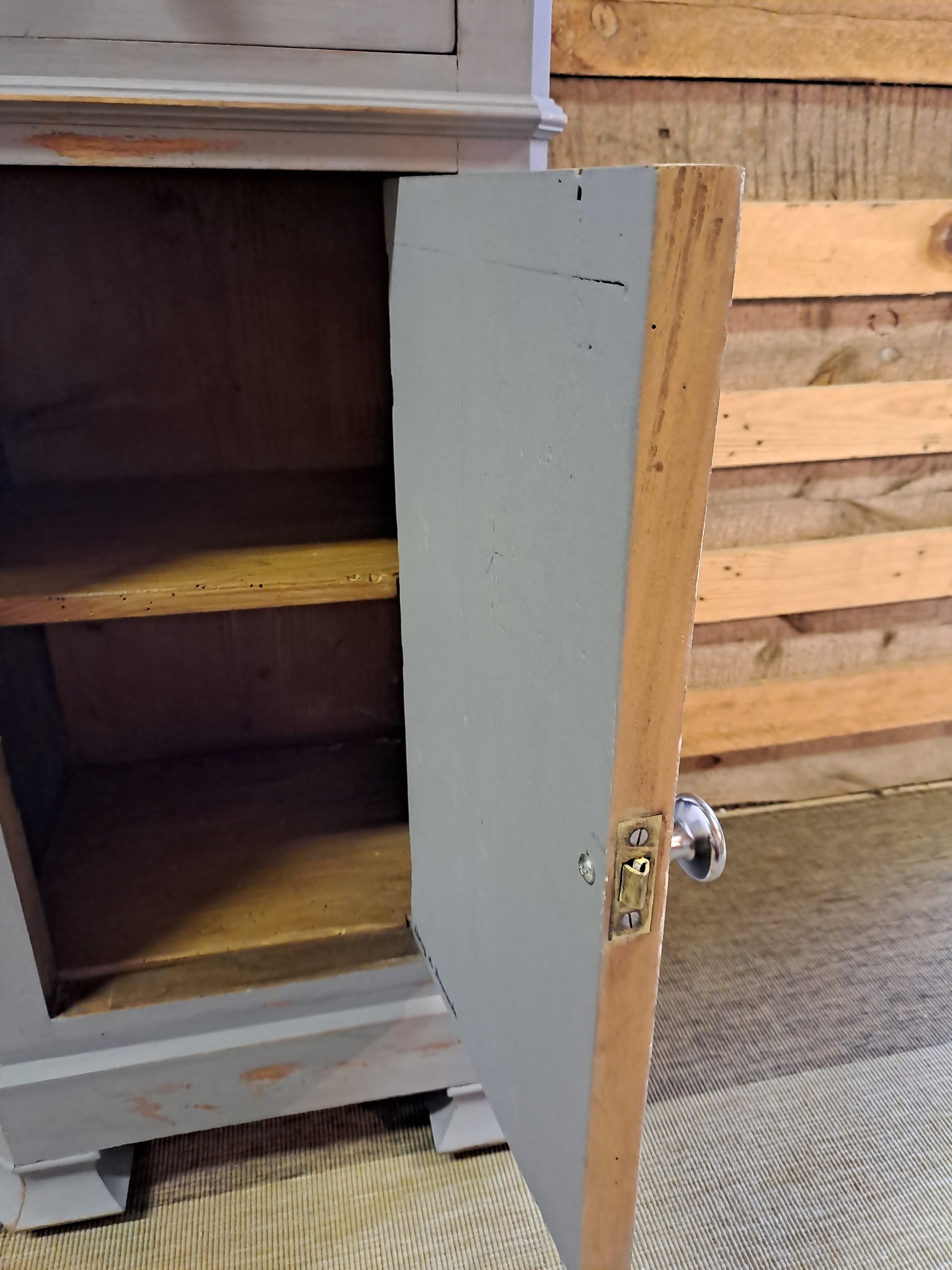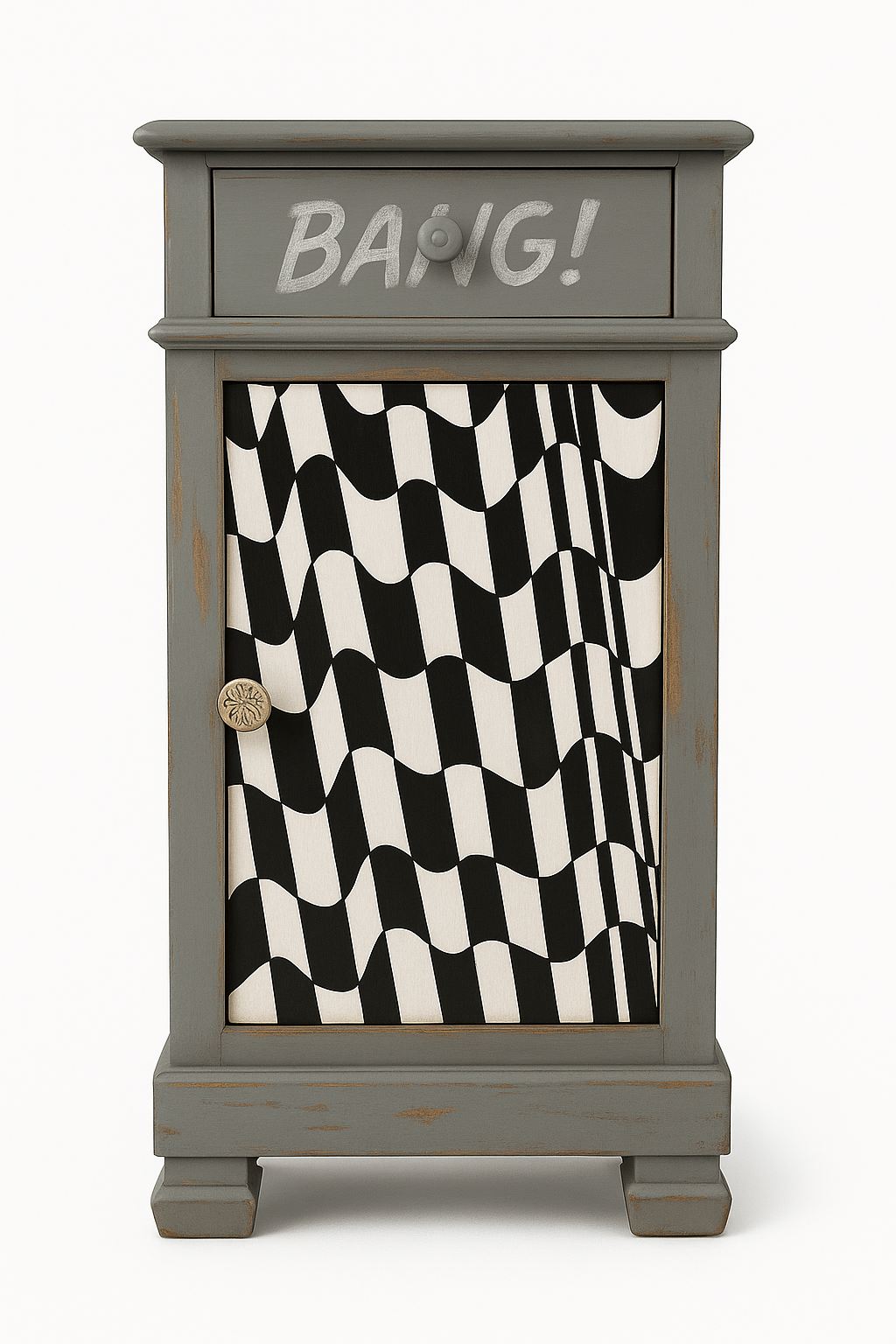 Relookée avec de la peinture acrylique noire, grise et blanche. Sur la porte, j'ai voulu apporter un effet original en peignant à la main des lignes par ondulations pour créer une illusion de vagues noires et blanches. Elle est munie d'un bouton cadran de montre fait artisanalement. Peinture acrylique protégée par un vernis acrylique de haute qualité. Hauteur : 72 cm - Largeur : 38 cm - Profondeur : 32 cm. Prix : 130 € (livraison sur devis)